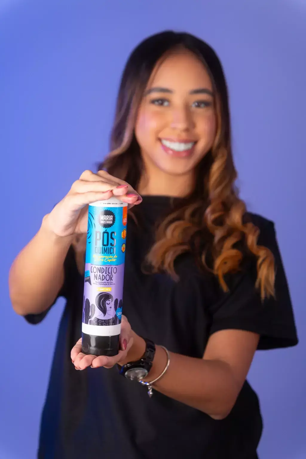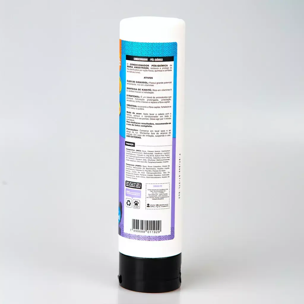 Aplicação: Após lavar o cabelo com o Xampu Pós-Química da Maria Amostrada, aplique o condicionador em todo o comprimento e nas pontas.