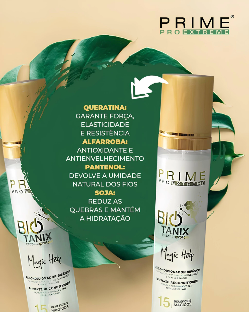 O Magic Help Bifásico 60ml – Prime Pro Extreme é um recondicionador capilar multifuncional que entrega 15 benefícios reais em um só produto. Ideal para todos os tipos de cabelos, especialmente os que sofrem com ressecamento, opacidade, frizz ou agressões externas.